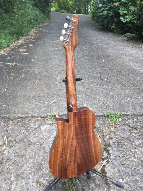 オーダー主さまのスケッチをもとにした左右非対称ボディです。 スケールは400ミリ コアトップバック、マダガスカルローズサイド ハカランダ指板、ブリッジ、ピックガード PUは fishmanAG+Mi-Siクリスタル